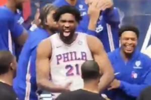 本场比赛,乔尔-恩比德出战23分钟砍下25分7板5助,但末节仅出战4分钟便下场,随后他在板凳上看着队友扳平了9分的分差拖进加时并最终取胜!